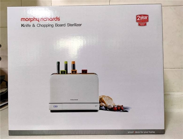 从摩飞二代(MR1001)刀具砧板消毒机的外包装上可见产品的渲染图,消毒机搭配了三款刀具和三款不同颜色的砧板,刀具和砧板的颜色搭配来区分生熟,使用完毕后进行消毒,做到食品制作的卫生安全,让家人的饮食更卫生健康。